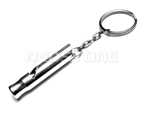 Oceľová kľúčenka - píšťalka. Rozmer: 9 x 46 mm.