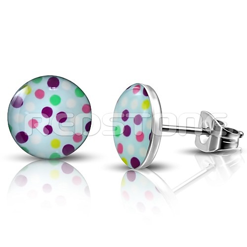 Náušnice s farebnými bodkami. Náušnice z chirurgickej ocele v kombinácii so živicou. Priemer náušníc: 10 mm