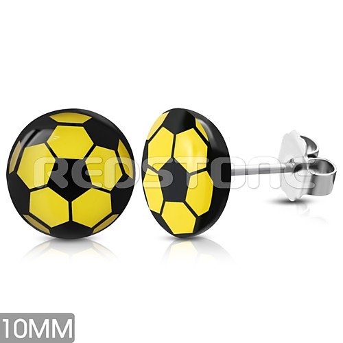 Náušnice s futbalovou loptou. Náušnice z bioplastu v kombinácii so zapínaním z chirurgickej ocele. Priemer náušníc: 10 mm.