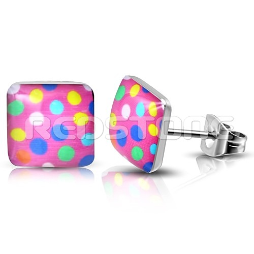 Farebné puzetové náušnice. Náušnice z chirurgickej ocele v kombinácii so živicou. Rozmer náušníc: 7 x 7 mm