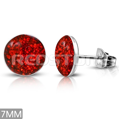 Náušnice z chirurgickej ocele v kombinácii s trblietkami ktoré sú zaliate v živici. Priemer náušníc: 7 mm Puzetové zapínanie.