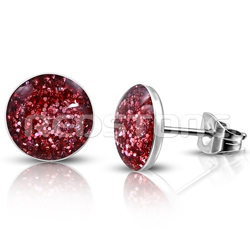 Náušnice z chirurgickej ocele v kombinácii s trblietkami ktoré sú zaliate v živici. Priemer náušníc: 7 mm Puzetové zapínanie.