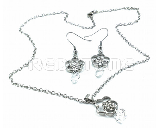 Komplet z chirurgickej ocele so zirkónmi, dĺžka retiazky: 450 mm, šírka náhrdelníka : 3 mm,rozmer náušníc : 45 x 13 mm vrátane háčika, rozmer prívesku: 25 x 13 šperky z chirurgickej ocele v lesklom prevedení