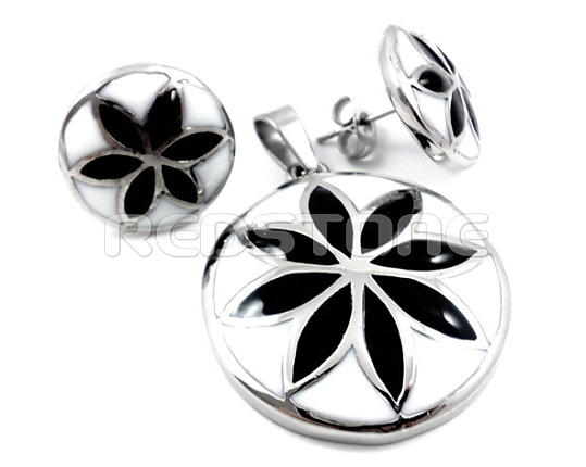 Komplet z chirurgickej ocele . Priemer prívesku: 28 mm, Priemer otvoru na retiazku: 3 mm, Priemer náušníc: 17 mm. Sada šperkov z chirurgickej ocele v lesklom prevedení.