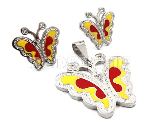 Sada šperkov z chirurgickej ocele. Rozmer prívesku: 30 x 26 mm. Rozmer náušníc: 19 x 17 mm. Farebné šperky z chirurgickej ocele v lesklom prevedení v kombinácii so zirkónmi.