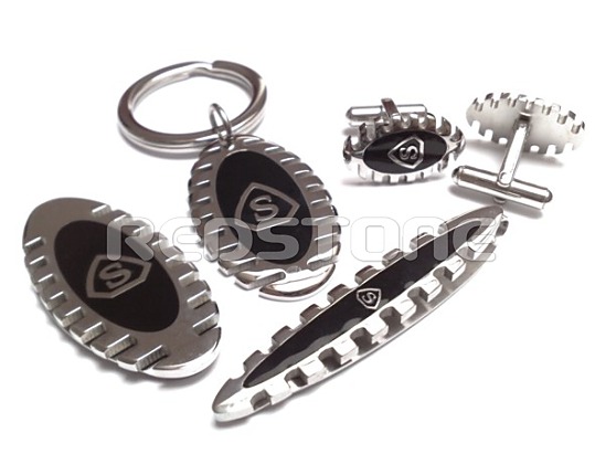 Komplet z chirurgickej ocele. Rozmer kľúčenky: 25 x 35 mm, Rozmer spony na peniaze: 56 x 25 mm, Rozmer spony na kravatu: 55 x 10 mm, Rozmer manžetových gombíkov 22 x 14 mm. Sada šperkov v lesklom prevedení. Dodávané v originálnej darčekovej krabičke.