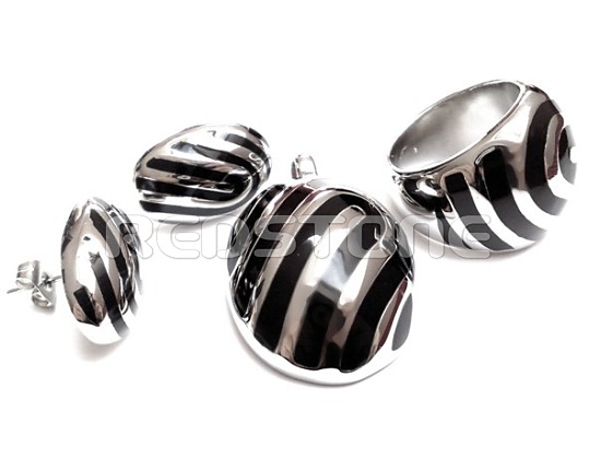 Komplet z chirurgickej ocele obsahujúci, náušnice, prívesok a prsteň. Rozmer náušníc: 12 x 20 mm, Rozmer prívesku: 25 x 35 mm, Veľkosť prsteňa: 54, Šírka prsteňa: 15/7 mm. Sada šperkov z chirurgickej ocele v lesklom prevedení.