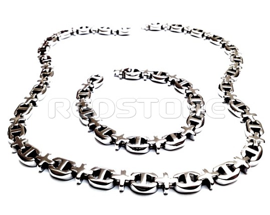 Komplet z chirurgickej ocele obsahujúci retiazku a náramok. Dĺžka retiazky: 550 mm, Šírka retiazky: 9 mm. Dĺžka náramku: 210 mm, Šírka náramku 9 mm. Sada šperkov z chirurgickej ocele v lesklom prevedení.