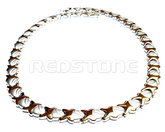Náhrdelník z chirurgickej ocele s magnetmi v kombinácii s pozlátenou chirurgickou oceľou. Dĺžka: 460 mm, Šírka: 9 mm. Šperk z chirurgickej ocele kombinovaný v lesklom a matnom prevedení.