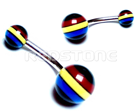 Piercing z chirurgickej ocele v kombinácii s bioplastom - UV guličky, piercing do pupka. Rozmer: 8 x 23 mm, Hrúbka tyčky: 1,6 mm, Priemer vačšej guličky: 8 mm, Priemer menšej guličky: 5 mm.