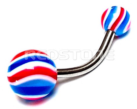 Piercing z chirurgickej ocele v kombinácii s UV bioplastom, piercing do pupka. Rozmer: 8 x 23 mm, Priemer vačšej guličky: 8 mm, priemer menšej guličky: 5 mm, šírka tyčky: 1,2 mm