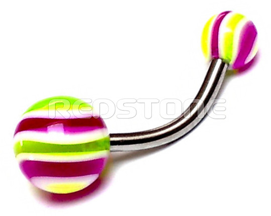 Piercing z chirurgickej ocele v kombinácii s UV bioplastom, piercing do pupka. Rozmer: 8 x 23 mm, Priemer vačšej guličky: 8 mm, priemer menšej guličky: 5 mm, šírka tyčky: 1,2 mm
