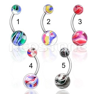 Piercing z chirurgickej ocele v kombinácii s bioplastom, piercing do pupka. Rozmer: 8 x 23 mm, Priemer vačšej guličky: 8 mm, priemer menšej guličky: 5 mm, šírka tyčky: 1,2 mm