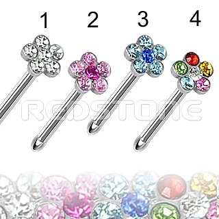 Piercing z chirurgickej ocele v kombinácii so zirkónom. Rozmer kvietku: 4 x 4 mm. Hrúbka tyčky: 0,8 mm. Dĺžka tyčky: 8 mm. Piercing do nosa.