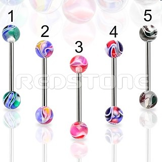 Piercing z chirurgickej ocele v kombinácii s UV bioplastom, piercing do jazyka. Priemer bioplastovej guličky: 6 mm, Hrúbka tyčky: 1,6 mm, Dĺžka tyčky: 16 mm.
