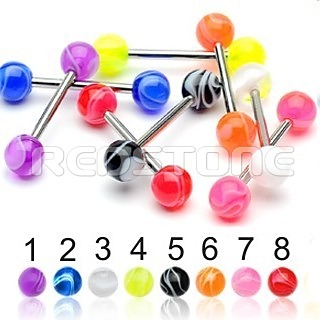 Piercing z chirurgickej ocele v kombinácii s UV bioplastom, piercing do jazyka. Priemer bioplastovej guličky: 6 mm, Hrúbka tyčky: 1,6 mm, Dĺžka tyčky: 16 mm.