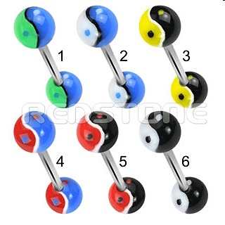 Piercing z chirurgickej ocele v kombinácii s UV bioplastom, piercing do jazyka. Priemer bioplastovej guličky: 6 mm, Hrúbka tyčky: 1,6 mm, Dĺžka tyčky: 16 mm.