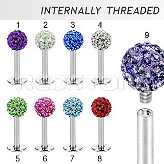 Labret z chirurgickej ocele v kombinácii s krištáľmi, labret do brady. Priemer guličky: 3 mm. Šírka tyčky: 1,2 mm, dĺžka tyčky: 6 mm.