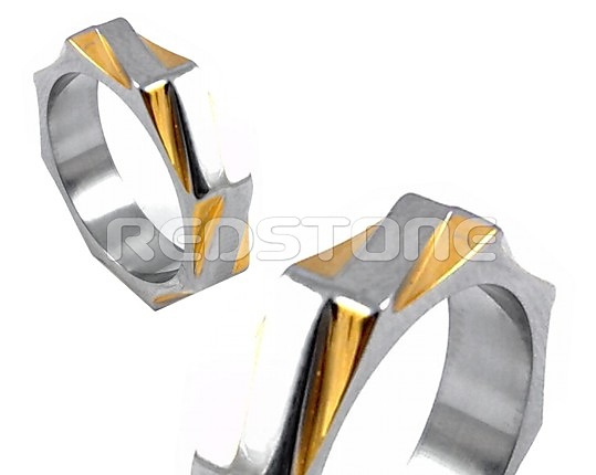 Prsteň z chirurgickej ocele v kombinácii s pozlátenou chirurgickou oceľou. Šírka prsteňa: 5 mm. Šperk z chirurgickej ocele v lesklom prevedení.