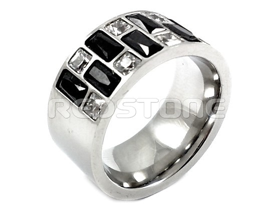 Prsteň z chirurgickej ocele. Šírka prsteňa: 10 mm. Šperk z chirurgickej ocele v lesklom prevedení v kombinácii so zirkónmi.