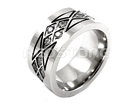 Prsteň z chirurgickej ocele. Šírka prsteňa: 10 mm. Šperk z chirurgickej ocele v lesklom prevedení v kombinácii so zirkónmi.