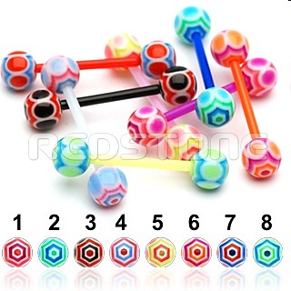 Pružný piercing - UV guličky, piercing do jazyka. Priemer guličky: 6 mm, Hrúbka tyčky: 1,6 mm, Dĺžka tyčky: 16 mm.