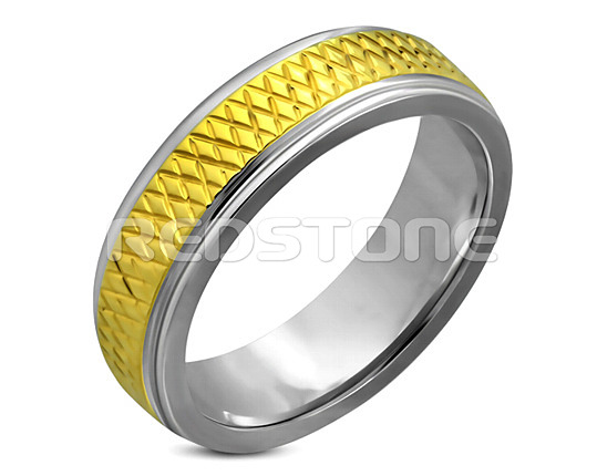 Prsteň - obrúčka z chirurgickej ocele s pozláteným stredovým pásom. Šírka prsteňa: 6 mm