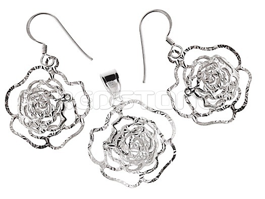 Sada strieborných šperkov - náušnice a prívesok. Hmotnosť spolu: 3,7 g. Rozmer náušníc: 19 x 20 mm. Rozmer prívesku: 19 x 20 mm.