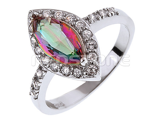 Rhodiovaný strieborný prsteň v kombinácii s mirko zirkónmi a topasom. Šírka: 15/3 mm. Hmotnosť prsteňa: 3 g.