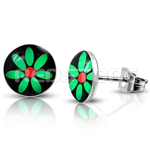 Farebné náušnice s kvietkom. Náušnice z chirurgickej ocele v kombinácii so živicou. Priemer náušníc: 7 mm