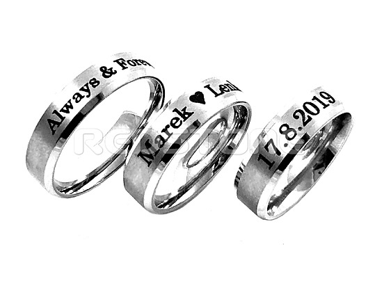 Obrúčka z chirurgickej ocele s gravírovaním na vonkajšiu stranu obrúčky.