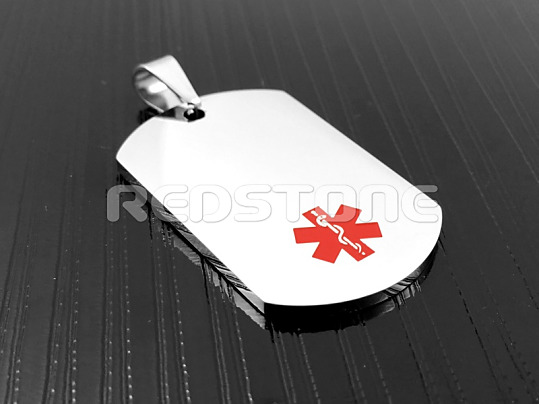 Prívesok z chirurgickej ocele s červenou hviezdou života a Vami požadovaných údajov.