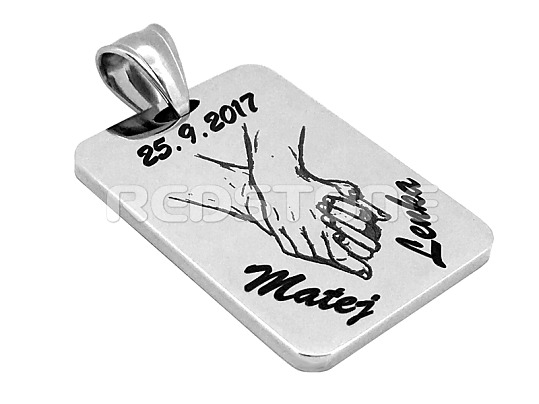 Prívesok z chirurgickej ocele v lesklom prevedení s vygravírovanými spojenými rukami a menami s dátumom podľa Vášho zadania