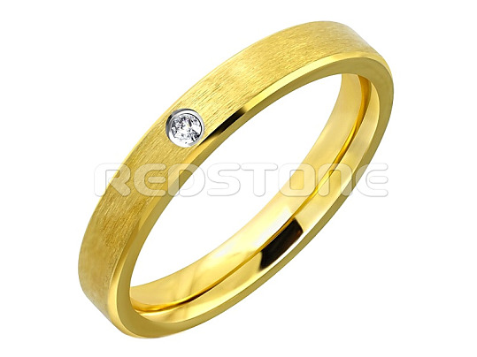 Pozlátená obrúčka z chirurgickej ocele v kombinácii so zirkónom. Obrúčka v matnom prevedení s lesklými krajmi.