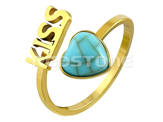Pozlátený prsteň z chirurgickej ocele v lesklom prevedení s nápisom KISS a srdiečkom s tyrkysom.