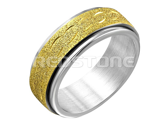 Prsteň z chirurgickej ocele s rotujúcim pieskovaným pozláteným stredom.