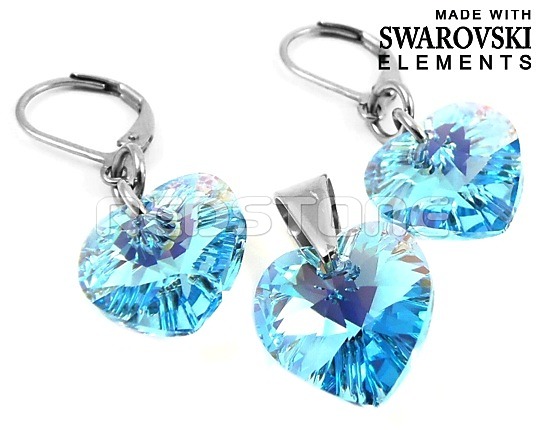 Sada šperkov z chirurgickej ocele v kombinácii so Swarovského krištáľom. Rozmer srdiečka: 14,4 x 14 mm. Celková dĺžka náušníc: 32 mm. Swarovski krištáľ vo farbe: Aquamarine AB.