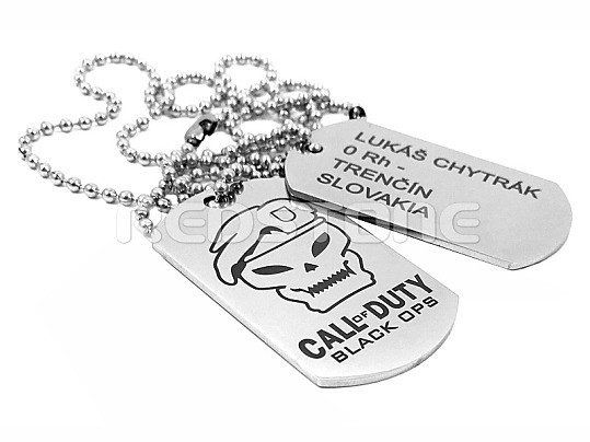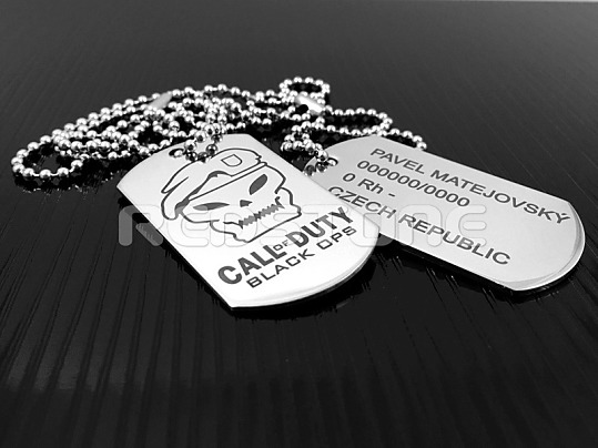 Sada jednostranných vojenských známok v matnom prevedení s jednou známkou s vygravírovanými Vašimi údajmi a s druhou známkou s vygravírovaným logom CALL OF DUTY.