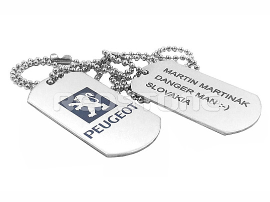 Vojenské známky s údajmi a logom PEUGEOT