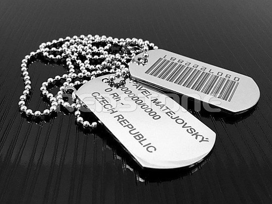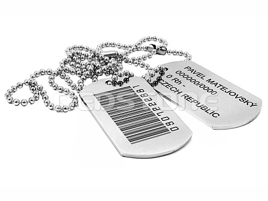 Sada jednostranných vojenských známok v matnom prevedení s jednou známkou s vygravírovanými Vašimi údajmi a s druhou známkou s vygravírovaným čiarovým kódom ktorý bude vytvorený na základe Vami zadaného čísla, minimálne 6 čísiel a maximálne 15 čísiel.