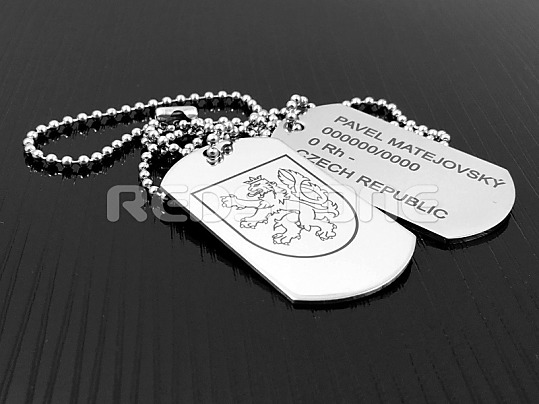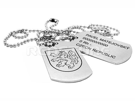 Sada jednostranných vojenských známok v matnom prevedení s jednou známkou s vygravírovanými Vašimi údajmi a s druhou známkou s vygravírovaným českým znakom.