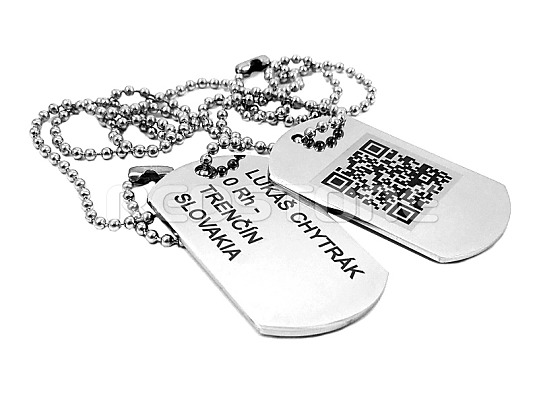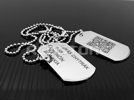 Sada jednostranných vojenských známok v matnom prevedení s jednou známkou s vygravírovanými údajmi, prípadne akýmkoľvek Vami požadovaným textom a s druhou známkou s vygravírovaným QR kódom.