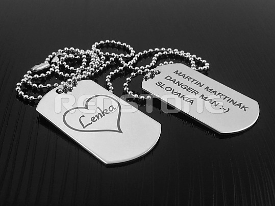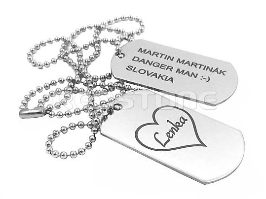 Sada jednostranných vojenských známok v matnom prevedení s vygravírovanými údajmi, prípadne akýmkoľvek Vami požadovaným textom a s druhou známkou so srdiečkom a Vami požadovaným menom.